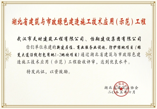 2025年8月4日,湖北省建筑业协会正式公布2025年上半年建筑与市政绿色建造施工技术应用工程验收评价结果,怡翔集团承建的"新建居住、商业服务业设施、防护绿地项目(雄楚大道沿线打包用地1-2地块项目)"首次申报并通过评审,达到优良水平。这一荣誉标志着怡翔集团在绿色建筑领域的创新实践获得突破,也为企业践行绿色低碳城市建设奠定了基础。