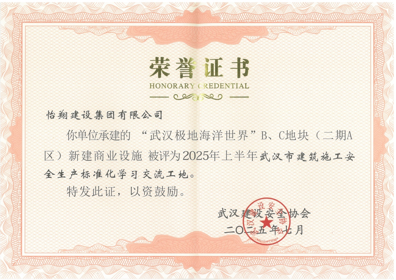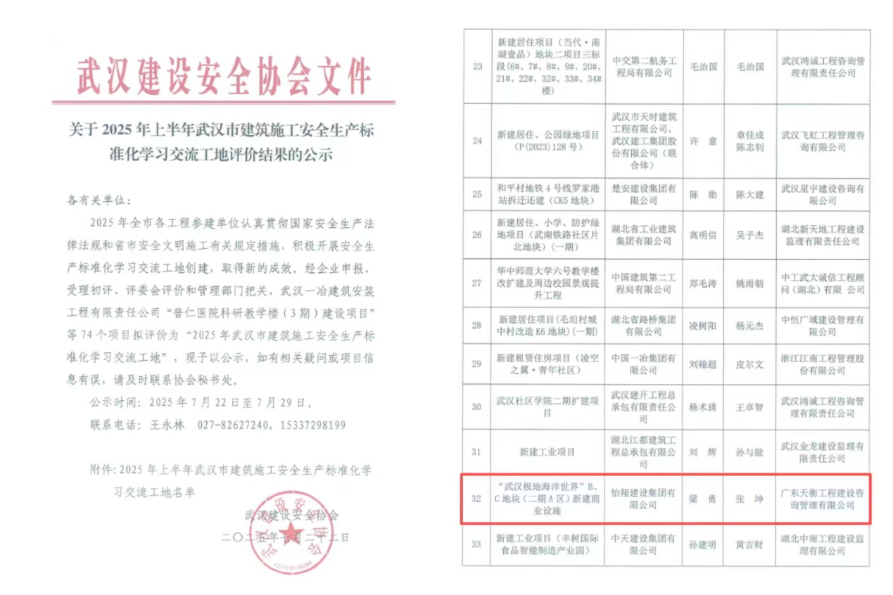 经企业申报、协会受理初评、评委会评价和管理部门审核等程序,武汉建设安全协会公布了“2025年上半年武汉市建筑施工安全生产标准化学习交流工地”的名单,怡翔集团承建的海洋主题文旅综合体项目“武汉极地海洋世界b、c地块(二期a区)”项目名列其中,获此殊荣。
