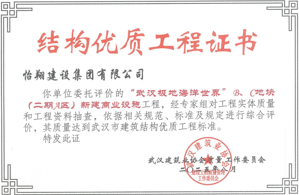 怡翔集团“武汉极地海洋世界项目”圆满完成创优目标,实现了安全和质量双优荣誉。公司将以此为契机,未来继续深耕,为实现国家“十五五”规划,为武汉创建成为一座宜居、宜业、宜游的现代化大都市贡献一份力量!